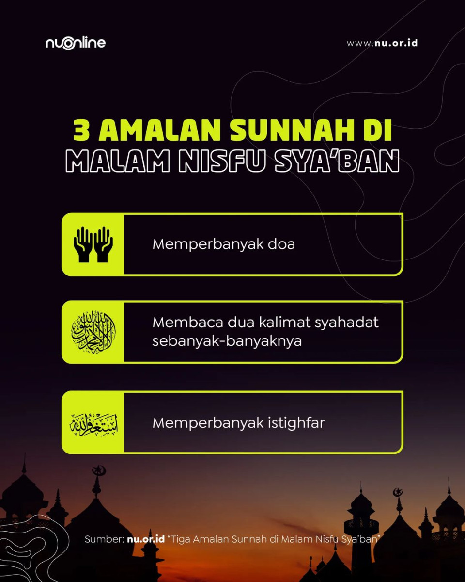 Tiga amalan yang dapat dilakukan pada malam nisfu Sya’ban. Tiga amalan ini disarikan dari kitab Madza fi Sya’ban karya Sayyid Muhammad Alawi Al-Maliki.